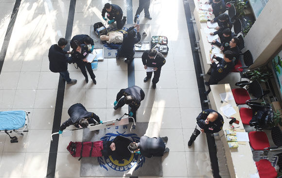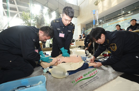 (救援人員正對傷員心肺復(fù)蘇模擬人進行心肺復(fù)蘇等應(yīng)急處置)