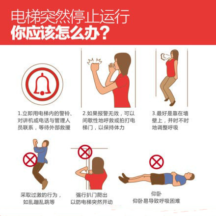 立即按下電梯內(nèi)的警鈴,或用對講機與管理人員取得聯(lián)系,也可以大聲呼叫或間歇性地拍打電梯門。若手機有信號,可以直接報警求助。在等待的過程中切勿采取過激的行為,切忌自行掰門,因為在電梯出現(xiàn)故障時,門的回路方面可能會發(fā)生失靈的情況,強行掰門會導致電梯異常啟動,容易墜入電梯井。切忌從天窗逃生,在轎廂門暫時無法打開的情況下,應由專業(yè)救援人員協(xié)助,斷電停機后才可從天窗逃出。