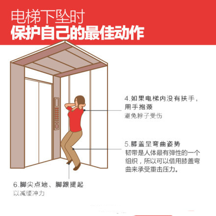 遇到電梯下墜應迅速把每層樓的按鍵都按下,這樣當緊急電源啟動時,電梯可停止繼續(xù)下墜。如電梯內(nèi)有把手,先一只手緊握把手,然后整個背部跟頭部緊貼電梯內(nèi)墻,以固定人所在的位置,以免摔傷。如電梯內(nèi)沒有把手,則雙手反撐電梯內(nèi)墻,整個背部跟頭部緊貼電梯內(nèi)墻,以固定身體。使膝蓋呈彎曲姿勢,用膝蓋彎曲來承受重擊壓力。