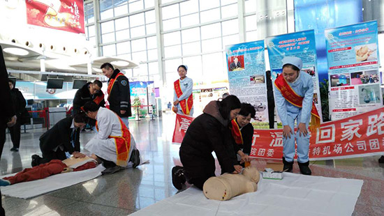 人民網(wǎng)呼和浩特1月13日電 13日春運進入天,上午九點,內(nèi)蒙古自治區(qū)人民醫(yī)院團委與呼和浩特機場公司團委聯(lián)合啟動了“青春志愿行 溫暖回家路”主題活動在呼和浩特市飛機場大廳舉辦。現(xiàn)場集體宣誓服務春運、培訓機場青年掌握現(xiàn)場緊急救護知識,包括心肺復蘇、身體不同部位出血緊急止血方法、骨折病人搬運等。