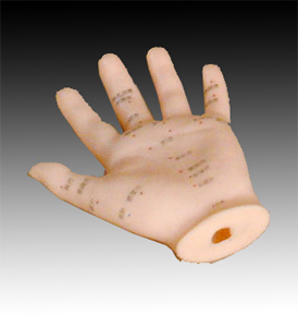 用軟而光亮的PVC制成的大規(guī)格的人手模型,顯示手背上的20個(gè)穴位和手心上13個(gè)穴位,穴位用漢字或數(shù)字標(biāo)注。附中英文使用手冊(cè)。