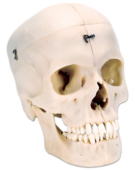 此款模型代表了一個完整正中垂直分部頭顱。它可以分拆為頭蓋骨的兩半和顱底,鼻中隔和完整下頜。為了顯示咀嚼肌運動,下頜可靈活移動。這是研究人顱骨結構和復雜解剖的極好顱模型。