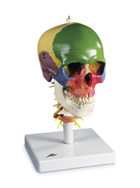 此款模型采用19種豪華色彩來展現頭顱各種骨片的形狀和關聯。豎于頸椎上并能靈活移動(C1, C2 及C7有色彩), 此款模型展示了菱腦、脊髓、頸椎神經、脊椎動脈、基底動脈和后腦動脈。置于基架上。