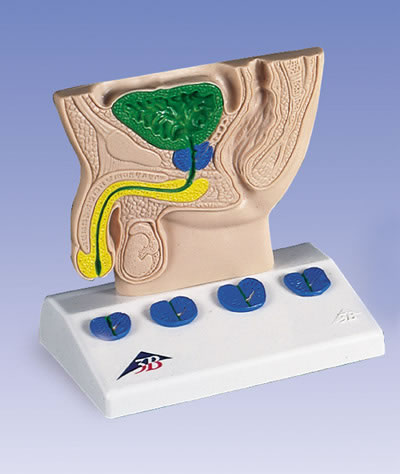 這款男性下體橫截面模型以圖解式描圖,實物一半大小展示了健康的前列腺帶膀胱、尿道、睪丸、陰莖、恥骨結合和直腸。通過四個橫截面可觀察到前列腺病變導致的尿道狹窄。帶有簡解彩圖。置于基架上。