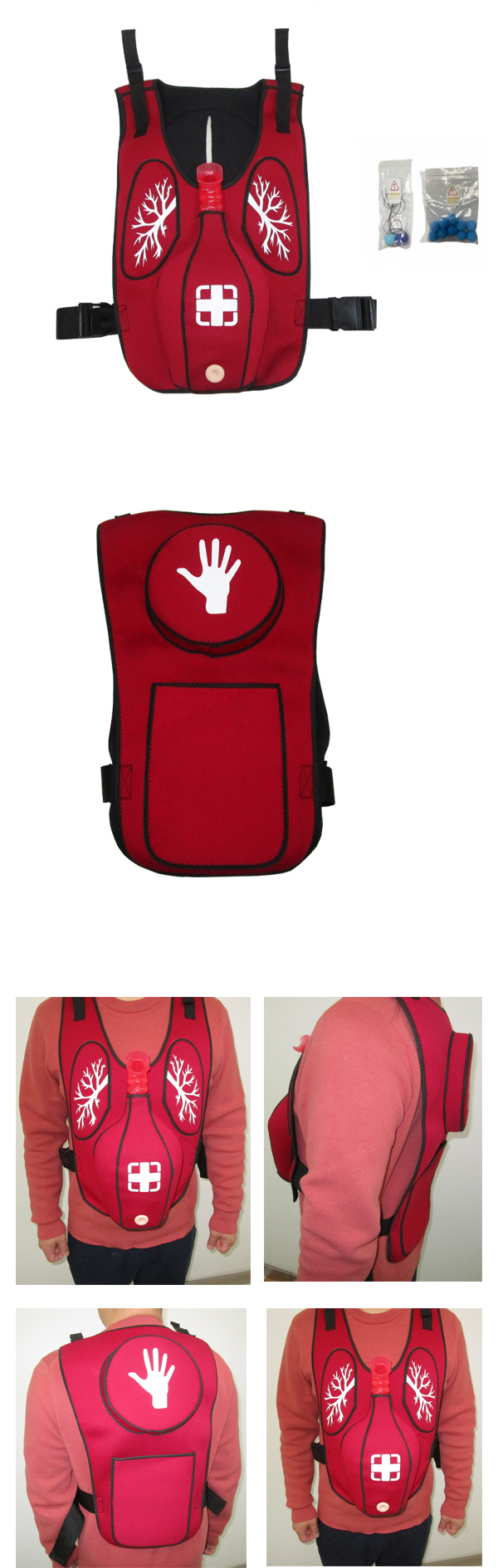 救援培訓專用窒息梗塞急救實訓穿戴馬甲,可有效避免因窒息急救不及時導致生命安全受到傷害。防窒息急救教育和實訓的時候,穿戴在學員身上,針對異物造成的呼吸氣道堵塞狀況時,練習腹部按壓(即海姆立克手法),做出正確步驟處理,擠出堵塞氣道異物(異物塞).直觀的教學模式給學員帶來自信和應用實效。模擬者可采用站姿、坐姿、用教具或借助柜臺、桌椅,實習體驗窒息自救、急救、達到救人一命的教學目的。
