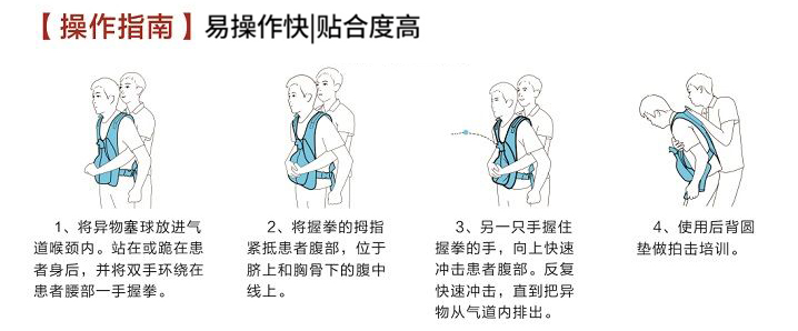 救援培訓(xùn)專用窒息梗塞急救實訓(xùn)穿戴馬甲,可有效避免因窒息急救不及時導(dǎo)致生命安全受到傷害。防窒息急救教育和實訓(xùn)的時候,穿戴在學(xué)員身上,針對異物造成的呼吸氣道堵塞狀況時,練習(xí)腹部按壓(即海姆立克手法),做出正確步驟處理,擠出堵塞氣道異物(異物塞).直觀的教學(xué)模式給學(xué)員帶來自信和應(yīng)用實效。模擬者可采用站姿、坐姿、用教具或借助柜臺、桌椅,實習(xí)體驗窒息自救、急救、達(dá)到救人一命的教學(xué)目的。