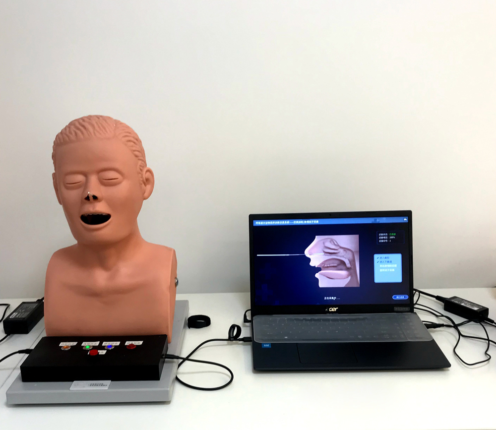 呼吸道分泌物采集訓(xùn)練仿真系統(tǒng),針對鼻咽和口咽拭子分泌物的采集訓(xùn)練而設(shè)計,系統(tǒng)分為硬件及軟件部分,在鼻咽及口咽相關(guān)位置設(shè)置傳感器,通過真實的鼻拭子或咽拭子在呼吸道分泌物采集模型上進行訓(xùn)練,按照采集的標準流程,可以對操作過程中的路徑、位置等信息進行采集,并反應(yīng)到PC端的模型上,形象化的展示拭子在采集過程中所處的解剖位置以及采集的部位是否正確,手感真實,可用于培訓(xùn)及考核。